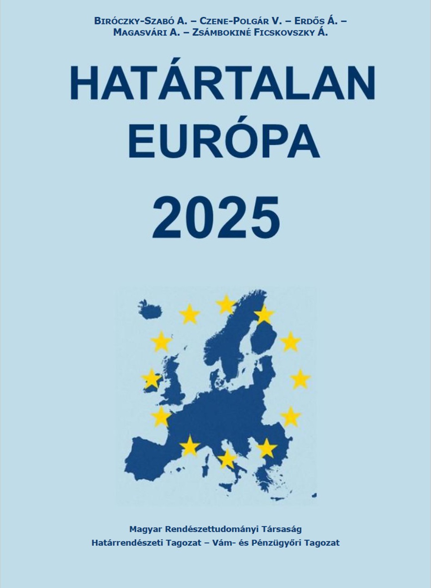 A Magyar Rendészettudományi Társaság Határrendészeti Tagozata és Vám‑ és Pénzügyőri Tagozata 2025-ben új, tudományos sorozatot indított útjára Határtalan Európa címmel. A sorozat első kötete olyan multidiszciplináris tanulmányokat foglal magában, amelyek a rendészet, a határigazgatás, a vám‑ és pénzügyőri tevékenység, valamint az európai integráció aktuális és jövőbe mutató kérdéseit vizsgálják. A kiadvány szerkesztői: Biróczky‑Szabó Andrea, Czene‑Polgár Viktória, Erdős Ákos, Magasvári Adrienn és Zsámbokiné Ficskovszky Ágnes.